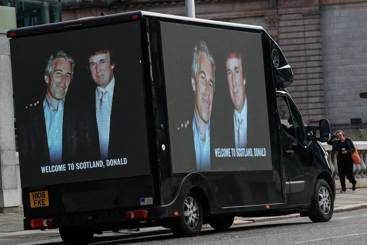 A person walks next to a mobile Ad Van that displays photographs of U.S. President Donald Trump and disgraced financier and sex offender Jeffrey Epstein, in protest of the visit of U.S. President Donald Trump in Aberdeen, Scotland, Britain, July 28, 2025. REUTERS/Hannah McKay
